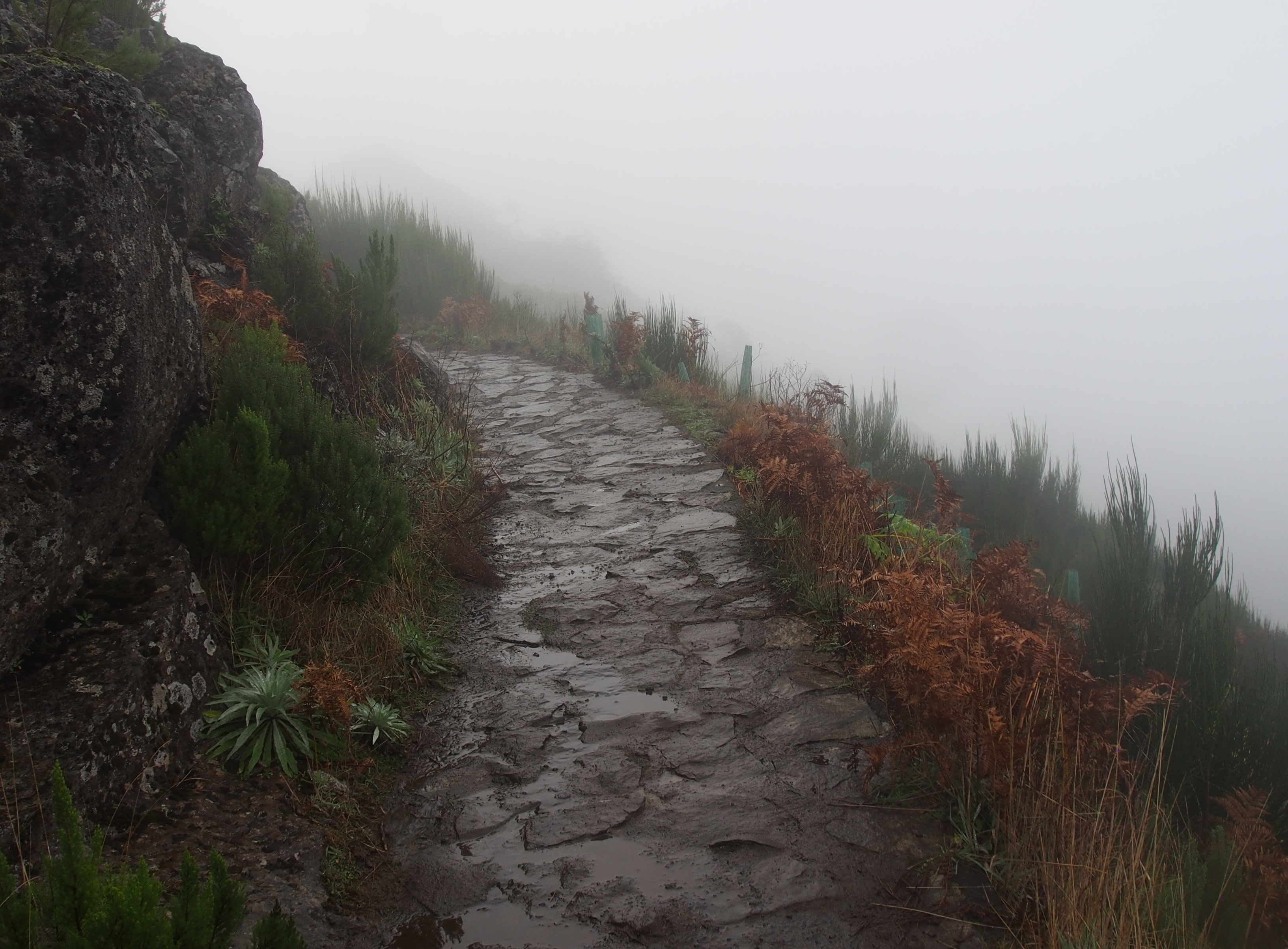 Denna dag hade vi otur med vädret. Det blåste 22 meter i sekunden från nordväst och vindarna förde med sig ett strilande regn. Ingen i gruppen föredrog att stanna kvar i bussen. Alla drog på sig regnkläder och började energiskt kliva uppför den branta sluttningen. Stigen, som var stensatt av svart basalt, gick inte rakt upp utan slingrade sig några varv runt toppen. Genom regnet kunde skymta Atlanten och efter att ha gått ungefär i 20 minuter kunde vi spana ner i en dimmig dalgång.
