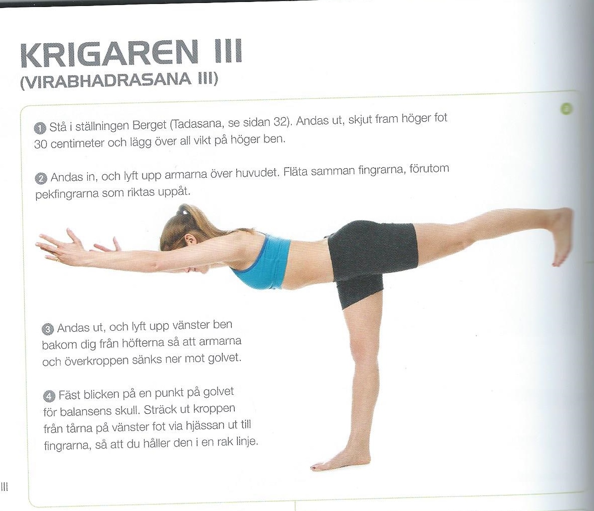 Övningen ”Krigaren” är betydligt lättare. Den fodrar inte stort utrymma och då och då bryter jag av mitt hamrande på datorn med dessa övningar. Här gäller det att hitta rytmen för andningen och att spänna magmusklerna. ”Krigaren” finns i tre varianter. De två första är enkla, medan den tredje är jobbig. Här skall allt stämma, att andas lugnt, att sträcka ut rygg och armar och att hålla balansen. Trots att jag kämpar dagligen med övningen har jag ännu inte lyckats. Jag måste vara försiktig. Det kan vara lätt att i ivern att se ut som bilden i boken förlora fotfästet på mattan och då falla ner på golvet.