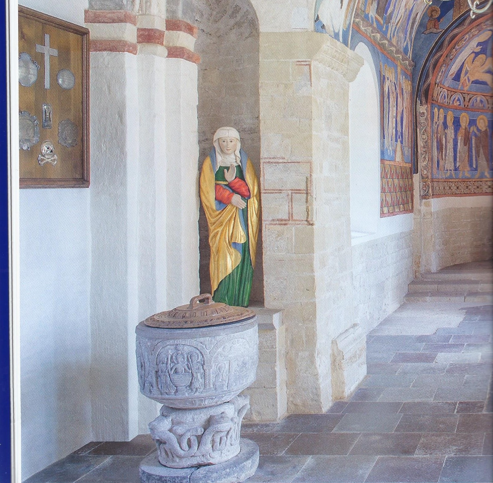 Bilden från Bjäresjö kyrka med dopfunten och trästatyn av Jungfru Maria har jag hittat i boken ”Kyrkornas hemligheter” författad av av Ann Chatherine Bonnier och Ingrid Sjöström